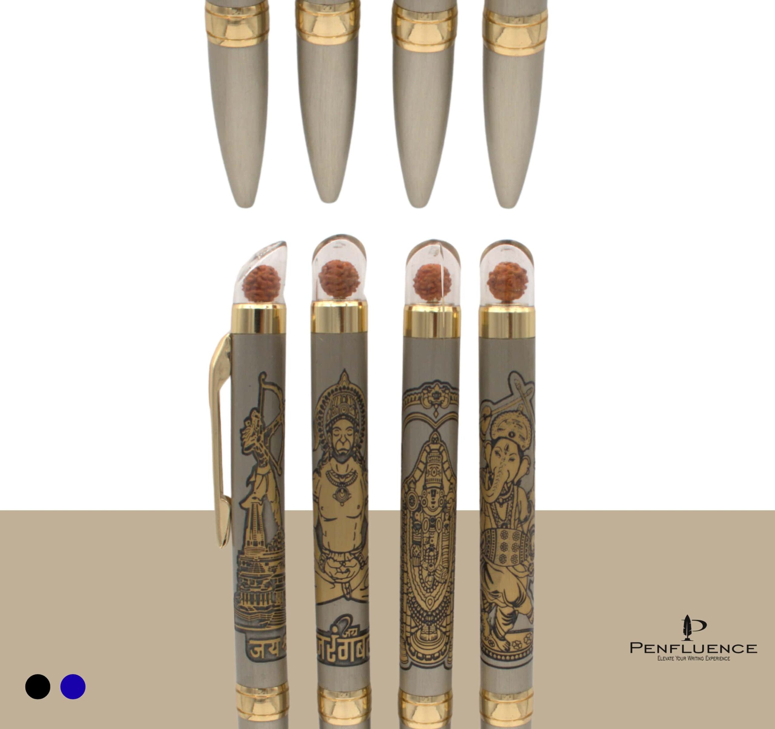 Each pen is intricately engraved with detailed divine artwork, representing Ganpati Bappa, Hanuman, Mahadev, and Ram Ji, rendered in fine line illustration that highlights craftsmanship and devotion.