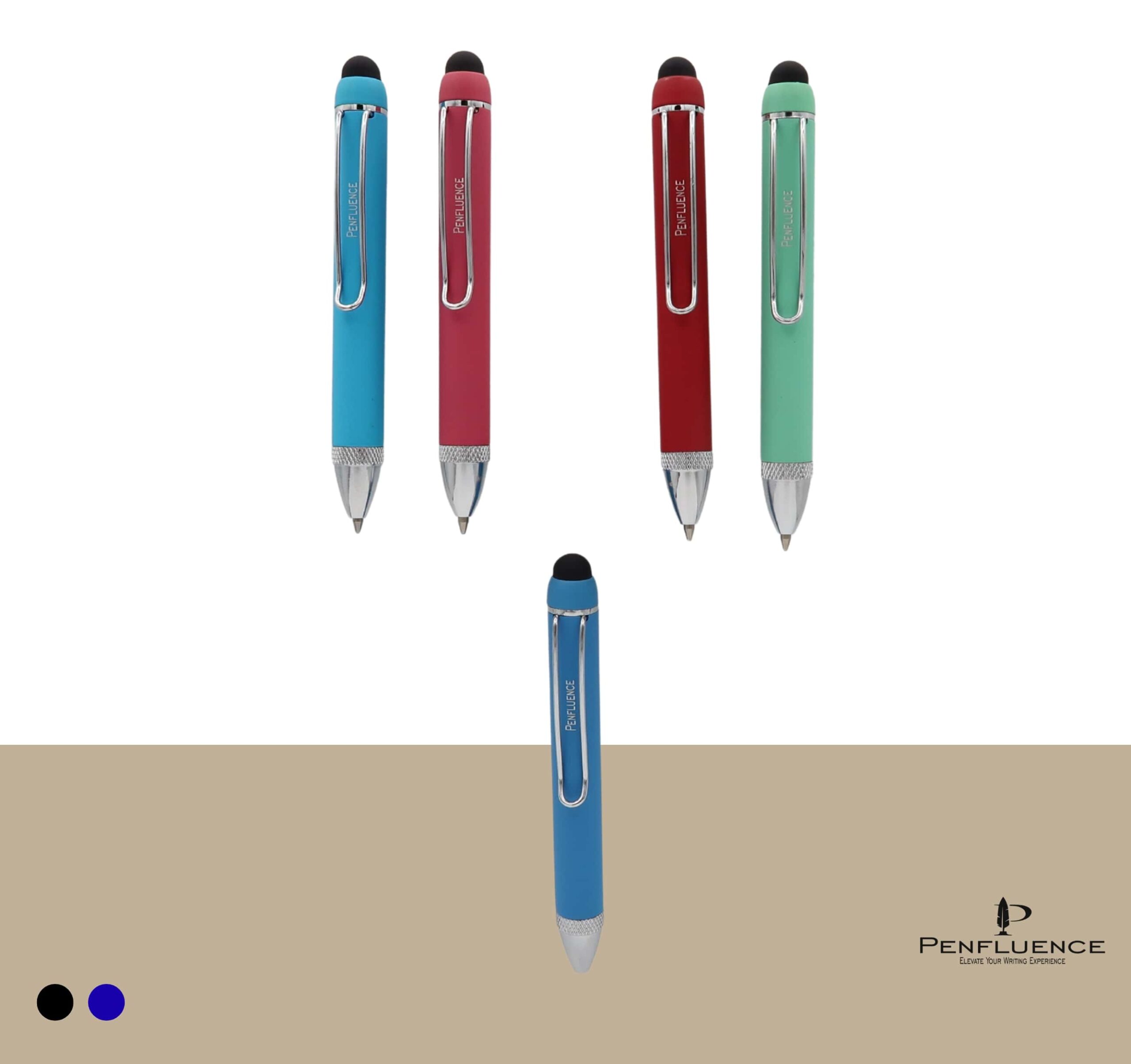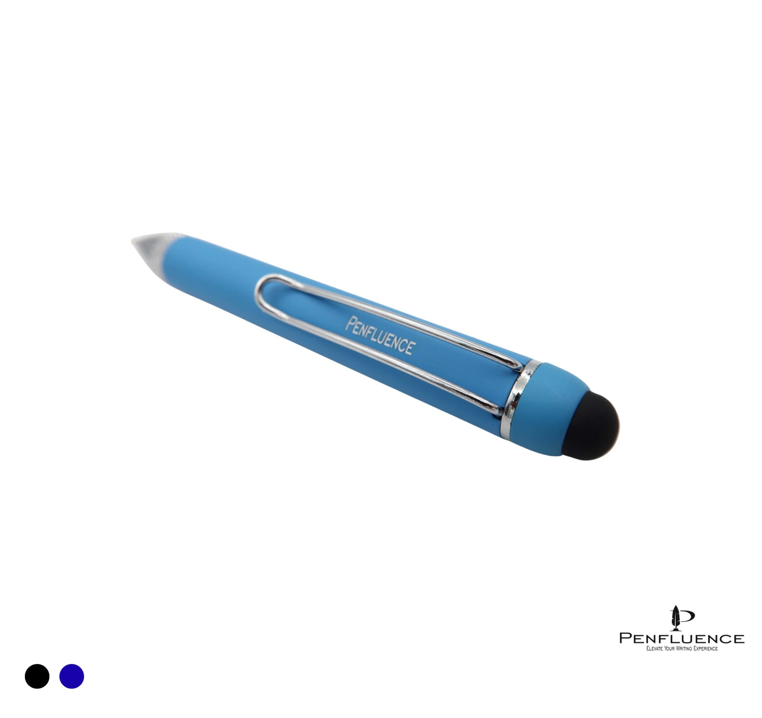 • A compact ballpoint pen with an integrated tiny stylus, designed for dual functionality.