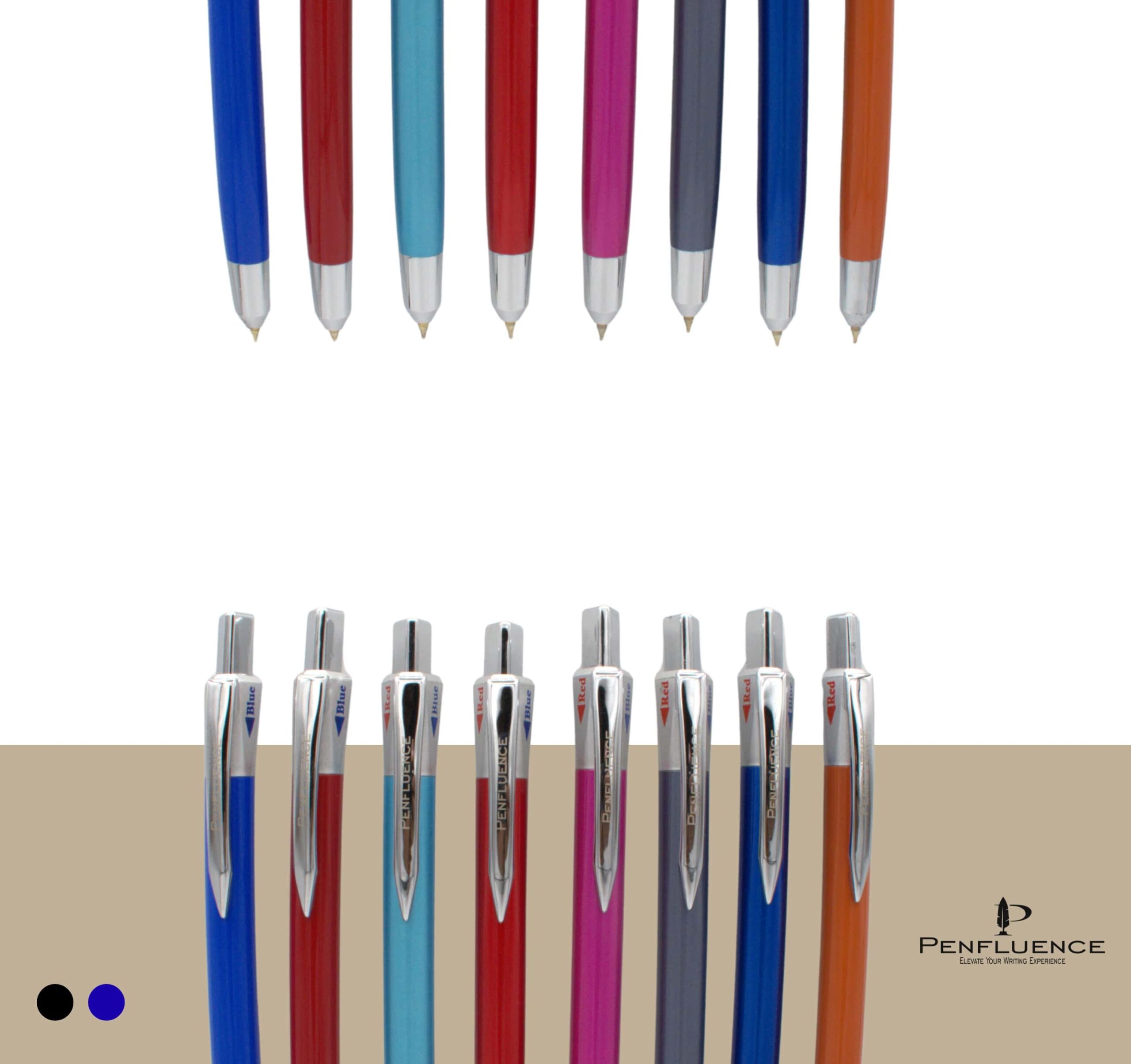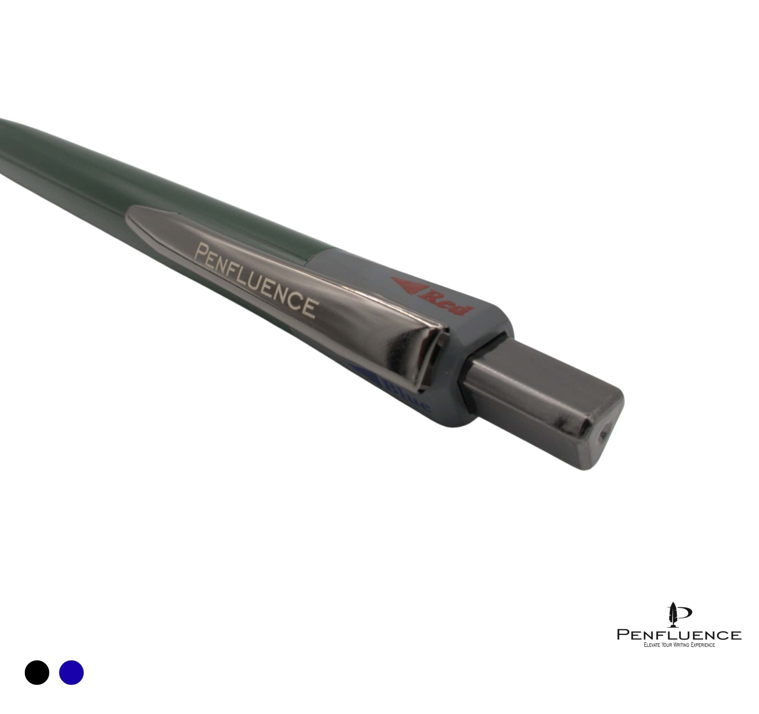 • The upper section houses a multi-selection mechanism that allows easy switching between ink colors, while a sleek integrated pocket clip adds practicality for everyday carry.